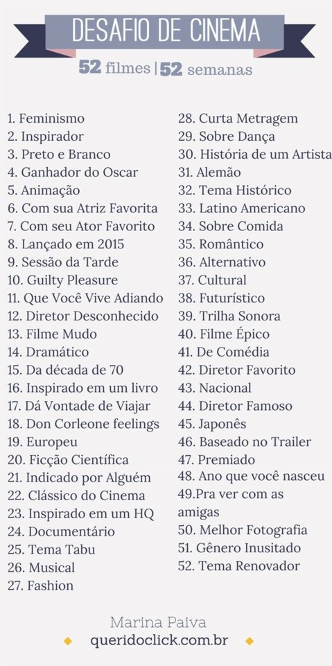 Por tudo isto, vi este desafio de 52 semanas versão filmes no blog da Alexandra e quis logo alistar-me ao desafio. E aqui vai.