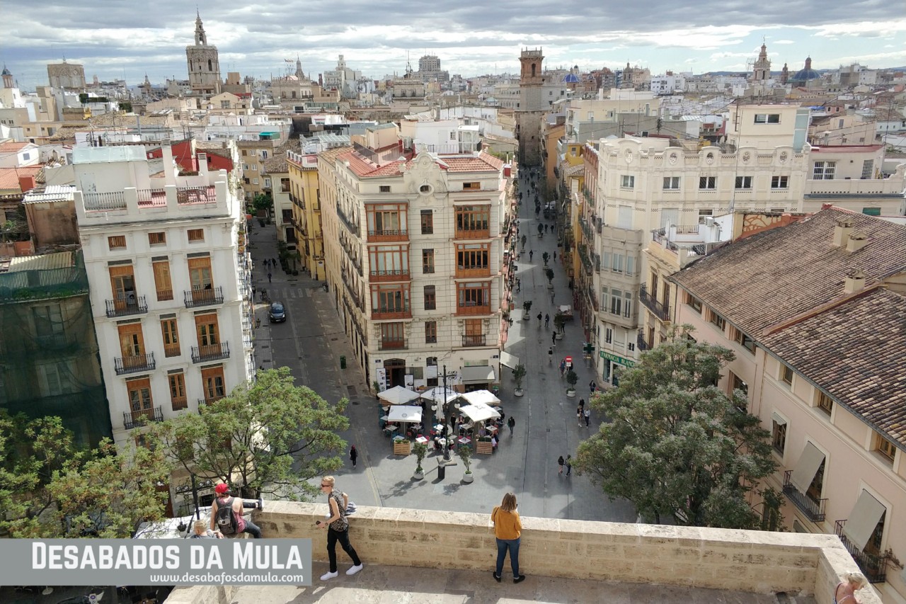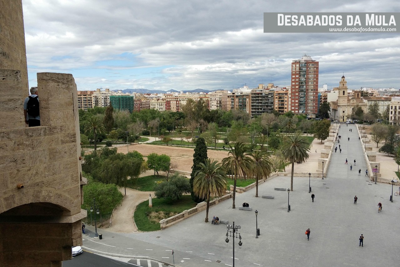Um pouco acima do centro histórico, bem visível aqui do cimo da Torre de Serrans, temos o Jardim de Túria, planificado no antigo Rio Túria. São nove quilómetros de jardins, pontes, lagos e diversos parques para diversas atividades para miúdos e graúdos. O Rio Túria foi desviado do centro de Valência após as inundações de 1957 que devastou a cidade e onde morreram 81 pessoas, assim de forma a evitar futuros incidentes, desviaram o rio e no seu canal construiram algo que as pessoas da cidade pudessem usufruir, sendo atualmente o maior parque espanhol.